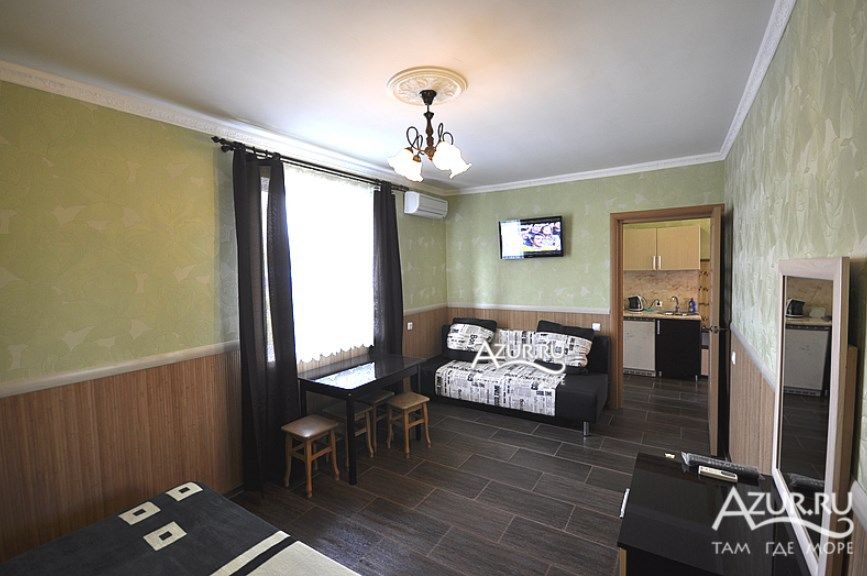 Описание: телевизор, кухня в номере, холодильник, кондиционер, туалет и душ в номере, санузел совмещенный, двуспальная кровать, диван-кровать.